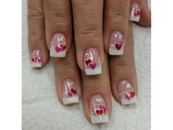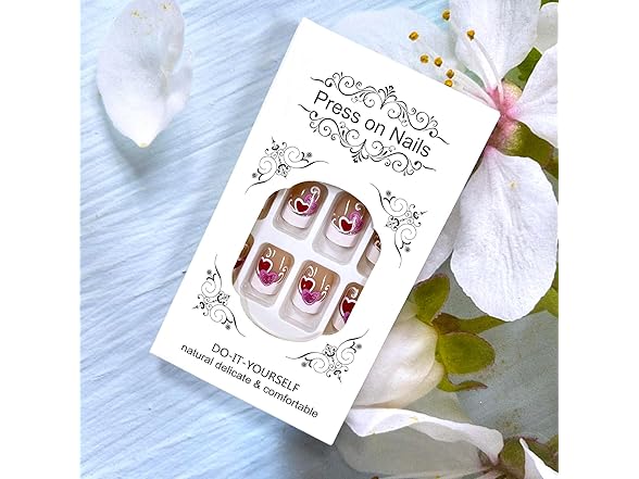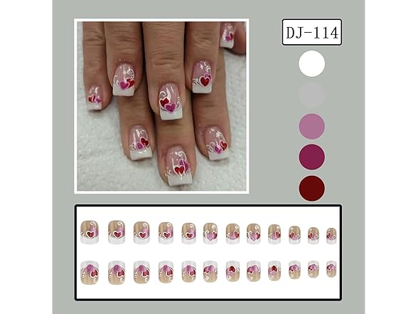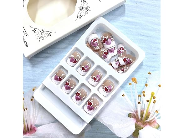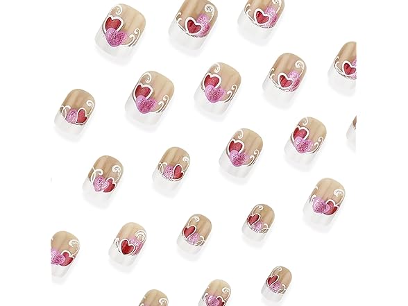 Valentine's White French Tip Press on Nails Short Square Pink Red Love Heart False Nails Silver Lines Design Stick on Nails Full Cover Aritificial Nails Valentines Acrylic Nails for Women