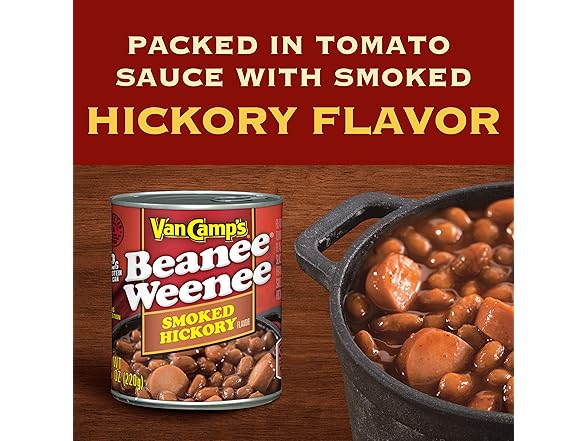 Delicious Van Camp's Smoked Hickory Beanee Weenee is a convenient canned food that's ready to heat and eat. Van Camp’s signature canned beans are combined with tasty sliced chicken franks and then simmered to perfection in a tomato sauce flavored with smoked hickory flavor. Enjoy these beans and hot dogs for a snack, as part of a meal or as a side dish. There are 12 grams of protein per serving. Preparing these beans and weenies is simple; just heat on the stovetop or in the microwave for a convenient treat that's ready in minutes. This 7.75 ounce can of hot dog weenies and beans is easy to store in the pantry. Van Camp’s has been making delicious beans for more than 140 years.