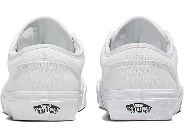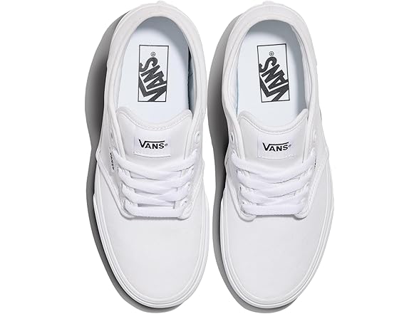 When it comes to keeping things simple, the Vans Women's Atwood low-top shoes cover all the bases. A sleek canvas upper, accented with the unmistakable Vans logo tag on the side, gives these ladies' sneakers a clean, minimalist vibe that meshes well with any dress code. The puffed-up tongue also features a branded logo treatment, delivering all-day comfort and understated style right out of the box. Featuring metal shoelace eyelets, durable vulcanized construction, and Vans' signature rubber waffle outsole for superior traction and flexibility, the Atwood sneakers are built for everyday wear – your go-to kicks for any situation. Off The Wall since 1966, Vans continues to inspire creativity and individuality.
