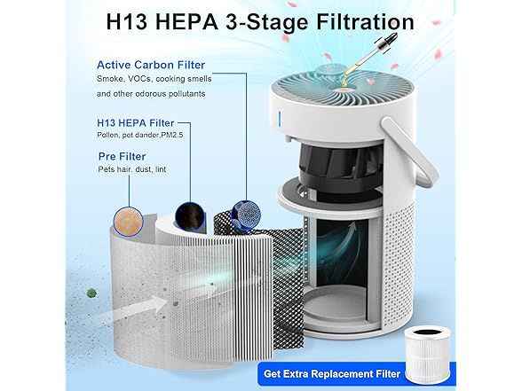 ๐ข๐ฅ๐ญ๐๐ซ ๐ฐ๐ข๐ญ๐ก ๐๐ซ๐จ๐ฆ๐ ๐๐๐ใ The hepa air purifier equipped with a 3-stage filtration system (Pre-filter + H13 True HEPA + Activated Carbon), it captures 99.97% of particles in the air down to 0.3 ฮผm. It effectively traps pet hair, dander, dust, smoke, odors and pollen.