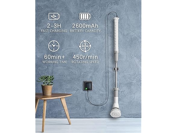 - 【Electric Spin Scrubber with Superior Batteries】Powered by rechargeable 5-volt battery, 2400 Advanced batteries, the cordless spin scrubber can last continuously up to 2.5 hour after only 2 hours fast charging. (The actual working time depends on the cleanliness of the area. For cleaning stubborn stains, the use time will be shortened.)