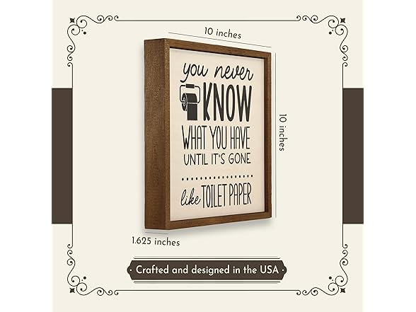 Introducing the You Never Know What You Have Until It’s Gone Toilet Paper Sign from Wall Things Co. - a stunning statement piece that will bring a touch of rustic sophistication to your bathroom. Printed with ink on high-quality maple veneer, the whole sign is made from solid wood. Crafted with a whitewash background that highlights the wood grain, this funny bathroom sign adds a unique charm and warmth to your living space. Printed with black ink rather than a vinyl sticker, the witty message pops against the rustic backdrop, creating a bold and eye-catching focal point for your home. Measuring 10 inches wide, 10 inches tall, and 2 inches thick, this modern farmhouse sign comes complete with a rustic frame that features a sturdy ledge for easy hanging with two screws or nails. And, due to the use of natural materials, no two signs are exactly alike, making each one a distinctive work of art that is as unique as it is captivating. This bathroom decor sign is the perfect gift for any occasion. With its timeless elegance and enduring durability, the "You Never Know What You Have" bathroom wall sign from Wall Things Co. is the perfect way to transform your living space and add a touch of rustic charm to your home. Our products are crafted and designed in the United States with utmost care and attention by a small, family-owned business.