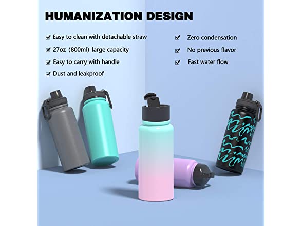 - ♻️【Humanization Design】 27oz (800ml) large capacity, easy to carry with handle. 3.35 inches diameter of bottom. Wide mouth for ice putting and easy to clean at any spot with detachable straw. Straw Lid designed for children to avoid choke, the 27oz size is perfect for kids to drink water the whole day when they at school.