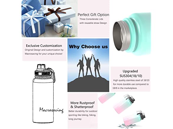 - ♻️【18/10 Stainless Steel and BPA Free】Vacuum double wall insulated water bottles with straw are produced of superior standard 18/10 stainless steel, 100% BPA free, odour free, non-toxic, eco-friendly food grade of other materials to protect your healthy hyration. We ensure your reusable water bottle avoid the polymers, plasticizers and other synthetic elements found in other bottles.