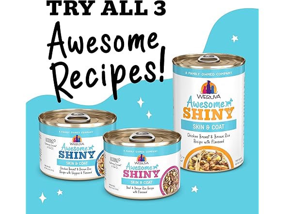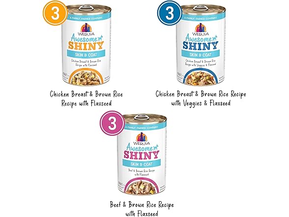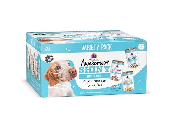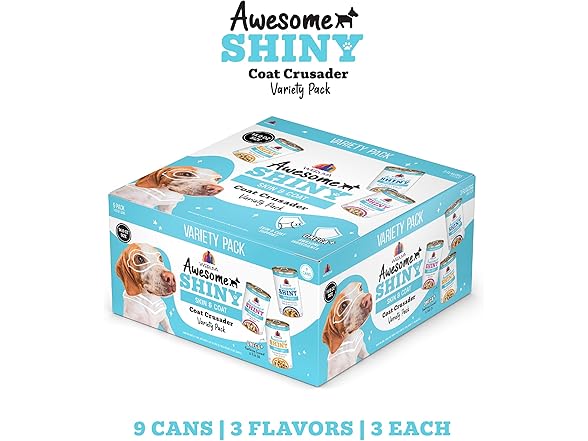 In the Box:- (1) Weruva Awesome Shiny Wet Dog Food, Coat Crusader Variety Pack, 14oz Can (Pack of 9)