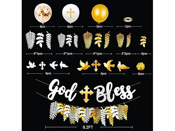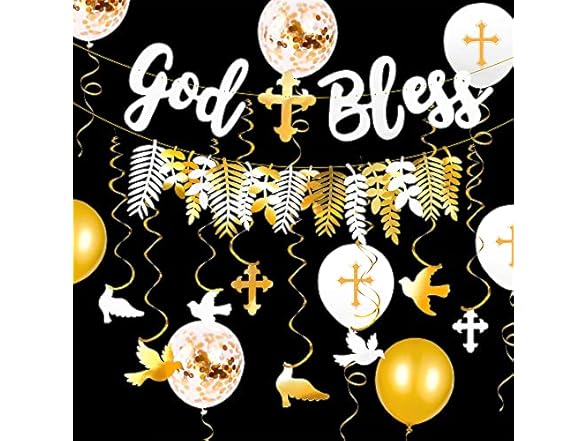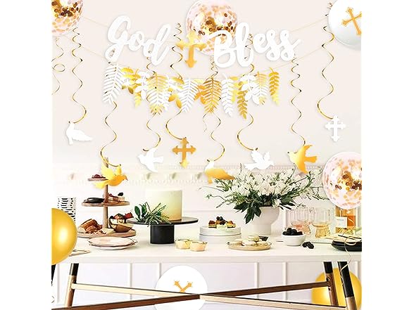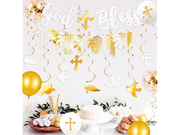 White and Gold Cross God Bless Party Decorations Dove Hanging Swirl Leaf Balloon Banner for First Holy Communion Religious Christian Baptism Wedding Bridal Baby Shower Birthday Anniversary Engagement