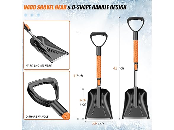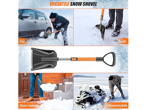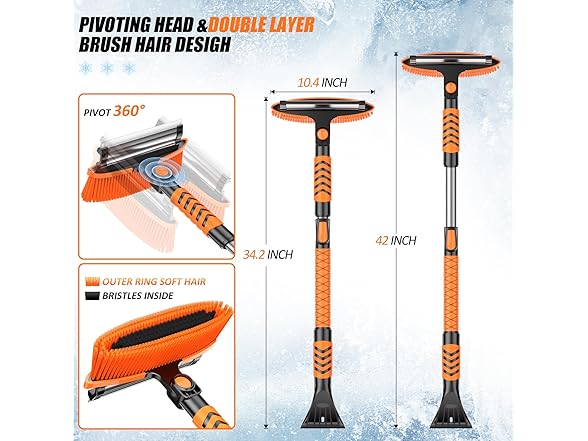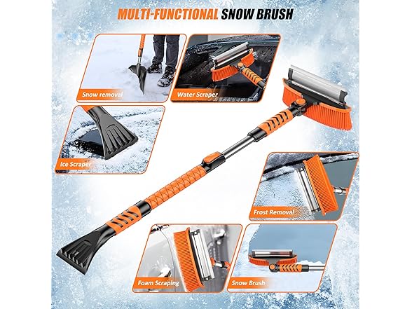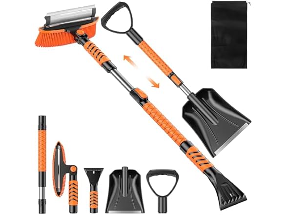 - MULTI-PURPOSE EXTENDABLE BRUSH & SHOVEL: The ergonomic design makes this snow scraper and brush versatile for a range of tasks. The snow brush easily sweeps away snow from your car, while the scraper on the top can clear thick snow and ice from the windshield and windows. The ice scraper at the opposite end removes frost quickly, and the extendable snow shovel helps clear snow fast, making winter prep a breeze