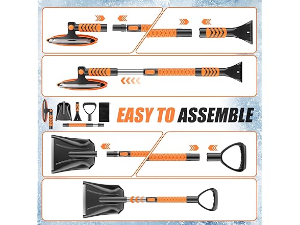 - EASY ASSEMBLY & STORAGE, PERFECT GIFT: This snow scraper for cars separates into four components—snow brush, ice scraper, snow shovel, and extendable aluminum handle—making it simple to put together. When disassembled, just place the kit into our storage bag, and it takes up minimal space, fitting perfectly in your vehicle or hanging in your garage for easy access during cold weather. This beautiful snow brush & snow shovel set is a must-have for car lovers, making it a perfect Christmas gift