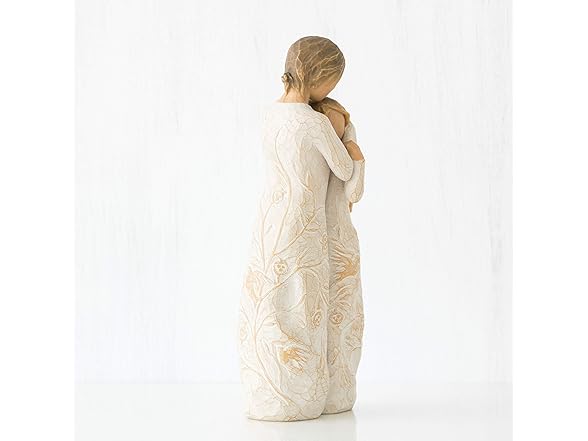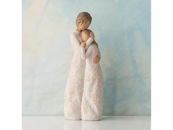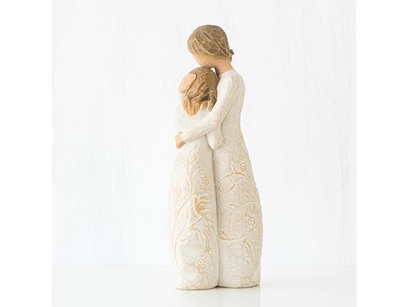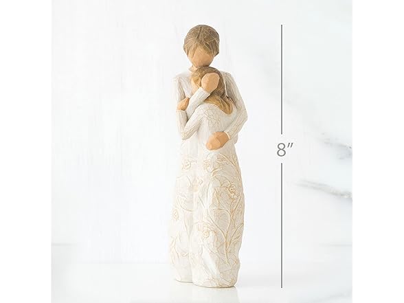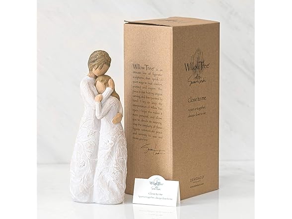 TITLE: Close to me SENTIMENT: Apart or together, always close to me GIFT-GIVING SUGGESTIONS: Carved with intertwined vines and birds in flight, Close to me is a mother/daughter figure that expresses the connection, yet freedom, which exists in the best of relationships, near or far. Willow Tree is a reminder of someone we want to keep close, or a memory we want to touch. Hand-carved figures reveal their expression through body gestures only... a tilt of the head, placement of the hands, a turn of the body. Since 1999, American artist Susan Lordi has worked in partnership with DEMDACO to produce, market and distribute Willow Tree , her line of carved figurative sculpture. From her studio in Kansas City, Lordi hand carves the original of each figure. This piece is cast from Lordi's original and painted by hand. Enclosed inside each fitted packaging box is a gift-giving card with piece title and sentiment on it. Each piece is intended to be open to interpretation from the viewer. "Willow Tree isn't so much about the tangible piece. It represents an emotion or it marks a memory." -Susan Lordi Ready to display on a shelf, table or mantel. To clean, dust with soft brush or cloth. Avoid water or cleaning solvents.