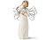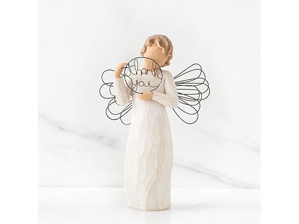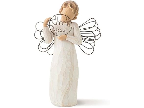 - 5.5”h hand-painted resin figure of a standing angel in cream dress with wire wings, holding words 'thank you' written in wire inside wire circle.