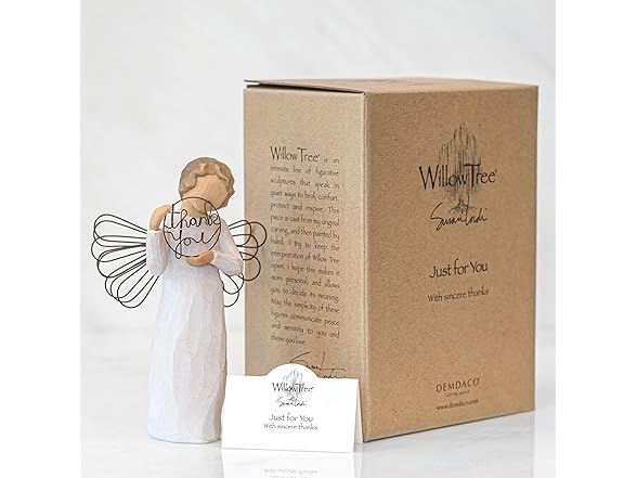 TITLE: Just for You SENTIMENT: With sincere thanks GIFT-GIVING SUGGESTIONS: A gift to express appreciation and thankfulness for teachers, volunteers, donors, caregivers, friends. Willow Tree angels resonate with many cultures and ages of people. To some they represent protection, to some they are an outward reminder of inner peace, and to some they represent a way to remember those who have left this earth. Hand-carved figures reveal their expression through body gestures only... a tilt of the head, placement of the hands, a turn of the body. Since 1999, American artist Susan Lordi has worked in partnership with DEMDACO to produce, market and distribute Willow Tree , her line of carved figurative sculpture. From her studio in Kansas City, Lordi hand carves the original of each figure. This piece is cast from Lordi's original and painted by hand. Enclosed inside each fitted packaging box is a gift-giving card with piece title and sentiment on it. Each piece is intended to be open to interpretation from the viewer. "Willow Tree isn't so much about the tangible piece. It represents an emotion or it marks a memory." -Susan Lordi Ready to display on a shelf, table or mantel. To clean, dust with soft brush or cloth. Avoid water or cleaning solvents.