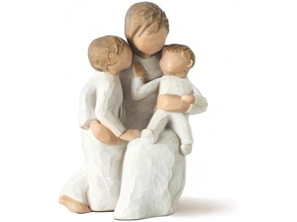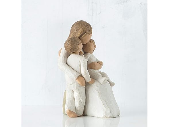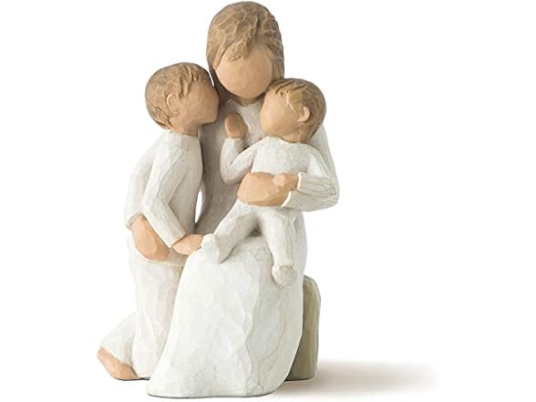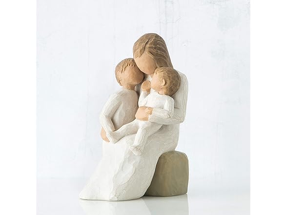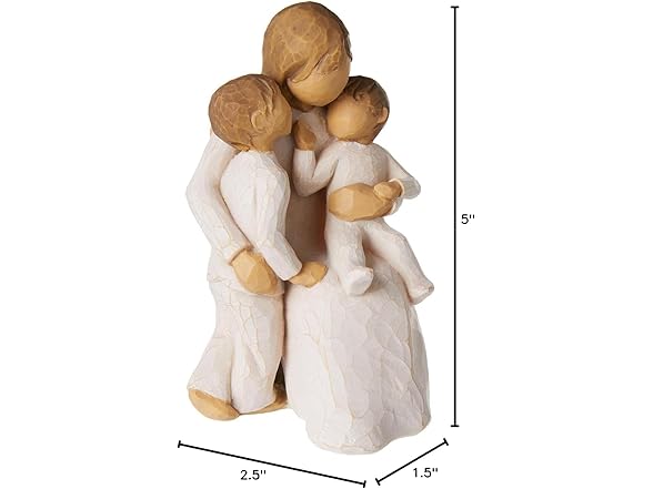 - 5”h hand-painted resin seated figure in cream dress, with one arm holding small toddler, other arm around older child standing next to her; toddler and child in cream onesies.