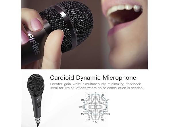 - 🎤CARDIOID DYNAMIC Karaoke MICROPHONE-Wired microphone with cord for karaoke features a cardioid pickup pattern for greater gain while simultaneously minimizing feedback. The plug in microphone, music stuff, is ideal for live situations where noise cancellation is needed, which makes the handheld DJ microphone corded remarkable for presentation, wedding, conference, church, interview and solo performances stage.