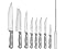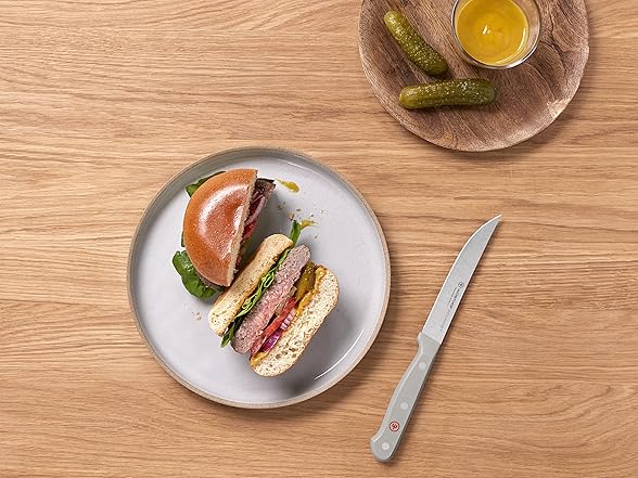 WÜSTHOF GOURMET SERIES – 8" Chef's Knife, 6" Utility Knife, 7' Santoku, 3" Spear Point Paring, 9" Honing Steel, (4) 4" Steak Knives with synthetic polypropylene handles that resist fading, discoloration, heat and impact. Precisely laser-cut stamped knives offer superb quality and value