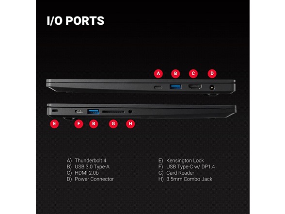 - Thunderbolt 4 (USB 4.0) *1 ,USB 3.0 Gen 2 Type-C (with DP1.4)*1, USB 3 Gen1 Type-A *2, HDMI 2.0b, Card Reader (UHS-I, SD/SDHC/SDXC), Audio 3.5mm Combo Jack, Power connector