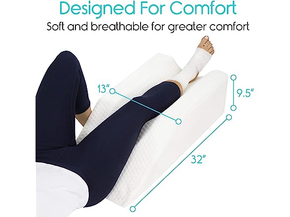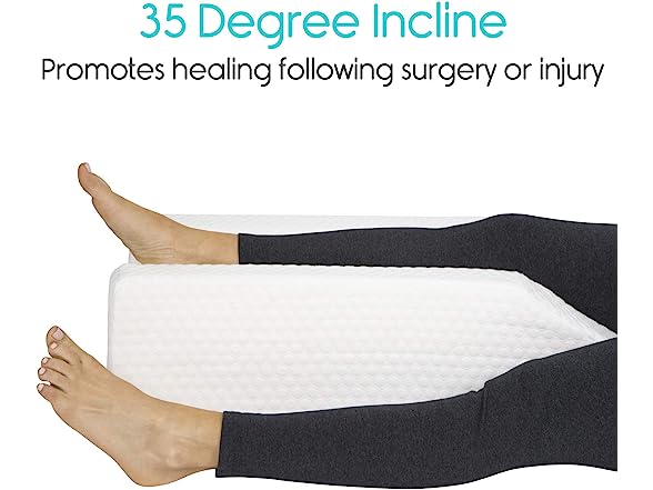 - OPTIMAL INCLINE AND ELEVATION: Properly positioning the knee, leg and ankle, the knee elevation pillow provides 35 degrees of incline, elevating the knee and calf 6.5”. The knee support wedge relieves swelling and fatigue to promote healing following ACL surgery, knee or hip replacement, as well as sprains, varicose veins, posterior tibial tendon dysfunction and more.