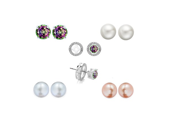 Yeidid 18K White Gold Plated 4 Pair Interchangeable Cultured Pearl and Rainbow Topaz Halo Stud Set