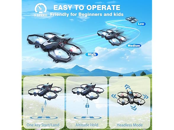 - Multifunctional: This multifunctional mini drones for kids perfectly meets your flying needs! Features one-key take off and landing, gesture photo/video, altitude hold and emergency stop.3D flips and headless mode add to the fun of flying. With three speed settings, it’s suitable for pilots of all skill levels—whether you’re a beginner or experienced, you’ll enjoy the thrill of flying!