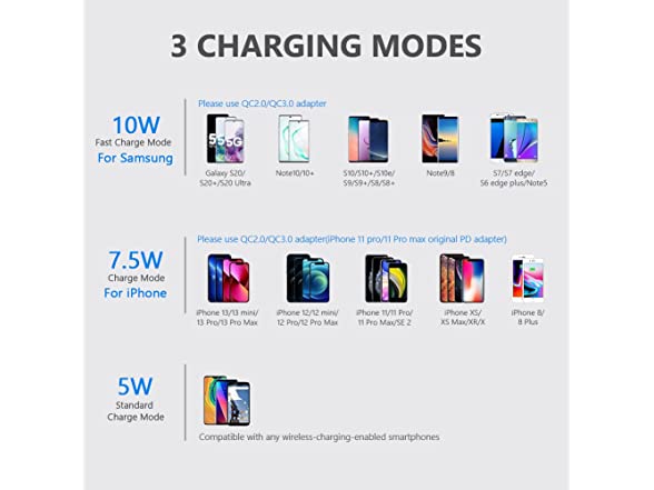 - ▶[3 CHARGING MODES AVAILABLE FOR DIFFERENT PHONES]: 7.5W charging mode is compatible with iPhone 13/13 Pro/13 Mini/13 Pro Max/SE 2022/12/SE 2020/11/11 Pro/11 Pro Max/XS MAX/XS/XR/X/8/8 plus with latest iOS System; 10W charging mode is compatible with S22/S22 Ultra/S21/S20/Note 10/10 Plus/S10/S10 Plus/S10E/Note9/S9/S8 and so on; 5W charging mode works on any wireless-charging-enabled phones like Google Pixel 3/3XL/4XL and so on.