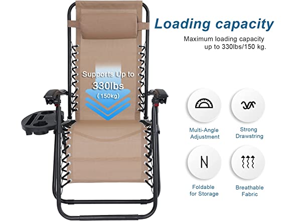 - Support up to 330lbs/150kg. An anti-gravity chair made of durable polyester fabric and powder-coated steel tube frame is rust-resistant. Double bungee provides extra support.
