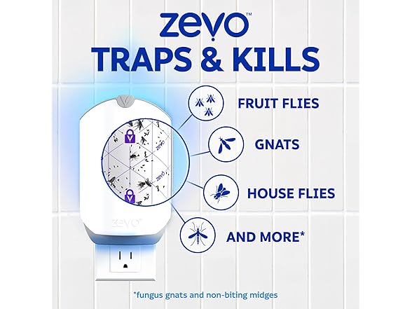 The Zevo Indoor Light Trap is a bug light trap indoor users will love, because it uses blue and UV light to continuously lure insects into the device. Once inside the flying insect light trap, insects will get stuck to a strong adhesive pad. This adhesive pad is part of the Zevo bug light refill, and can easily be popped out of the bug trap once it is full. Adding a new fruit fly trap refill into your device is quick and easy. Simply remove the sheet from its adhesive backing, insert the disposable cartridge and plug your trap back into the wall in a location where bugs frequent. You can pop one of these fly trap indoor refills into your device in your kitchen, bathroom, garage, screened in porch or any other living space. For optimal performance, check the cartridge every 15 days or as needed to replace it once its full of insects. The easiest way to ensure you always have a new cartridge ready to go is to stock up on these bug light refills, so you can pop the indoor fly trap refill into place whenever you need it. Each light trap refill is topped by a 'no mess tab' so you never have to actually touch a bug. Simply pull the bug trap refill out by this tab, and then dispose of it. While these are gnat traps for house indoor users will love, Zevo flying insect traps can be used to catch fruit flies, house flies and gnats.