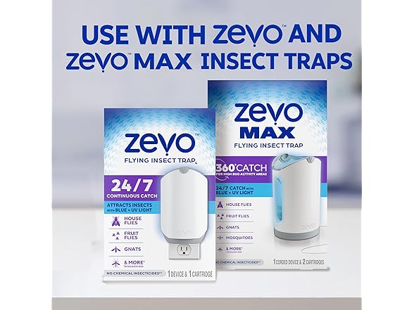 - Designed for Zevo Devices - The Zevo Flying Insect Trap Refill can fit in both our MAX or standard indoor fly traps. You can use either pest control plug in as a continuous bug catcher to effortlessly trap gnats, house flies and fruit flies.