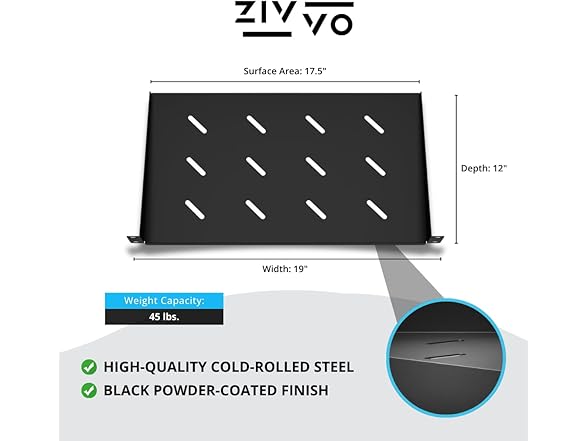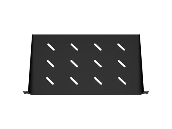 - TECHNICAL SPECS: Surface area 17.5" W x 12" D Thickness 1.75mm - Mounts to standard 19" racks and cabinets, and supports up to 45lb of networking, IT, Telecom, A/V equiement, and more. MATERIAL: Cold rolled steel with black powder coat finish.