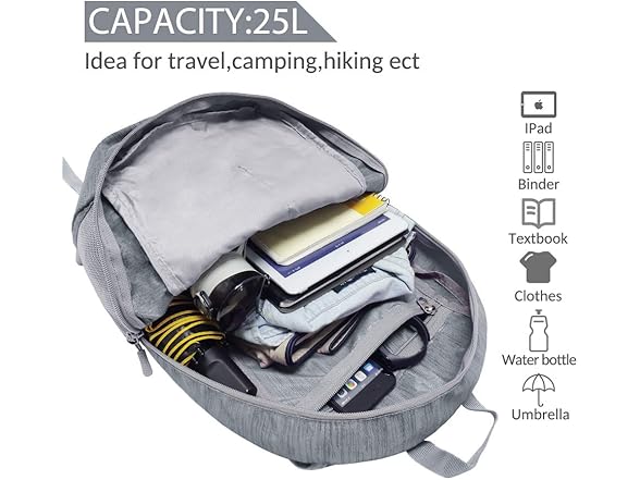 - Large Space: Packable hiking backpack water resistant 25L,there is enough,reasonable space to accommodate as many items as possible.There is a main bag and a front bag,compartment layer in the main bag,stored clothes,and various small objects;2 side bags store kettles and umbrellas;a inner bag stores important objects to protect your privacy