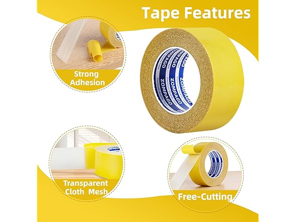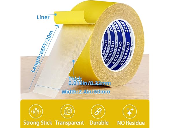 ZOMPAGO Heavy Duty Double Sided Mounting Tape, 2.4inx66FT, Clear Mesh Grip, Extra Strong Adhesive for Carpets, Wall Mounting, Picture Hanging and DIY Projects,Hand Tearable,Weatherproof